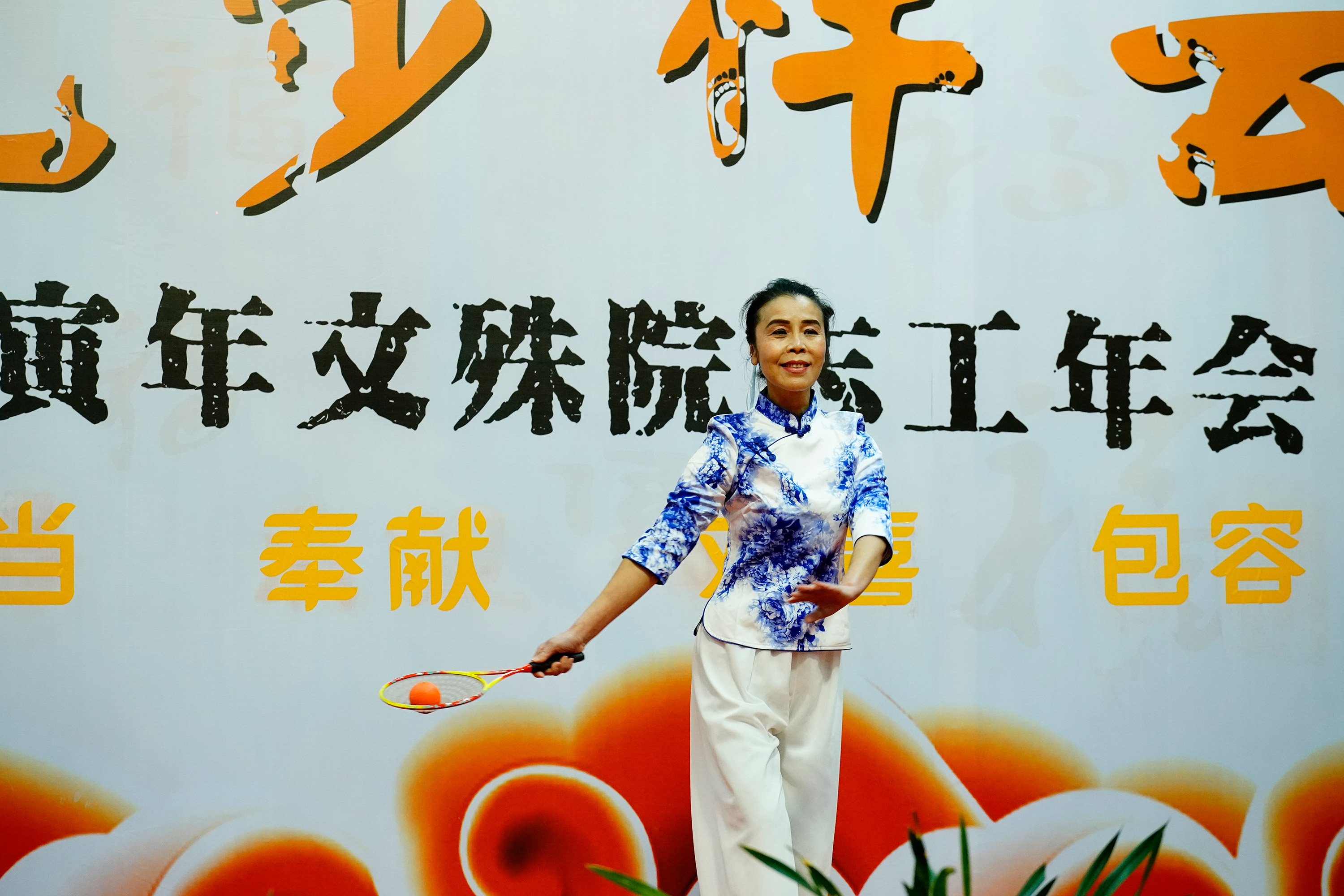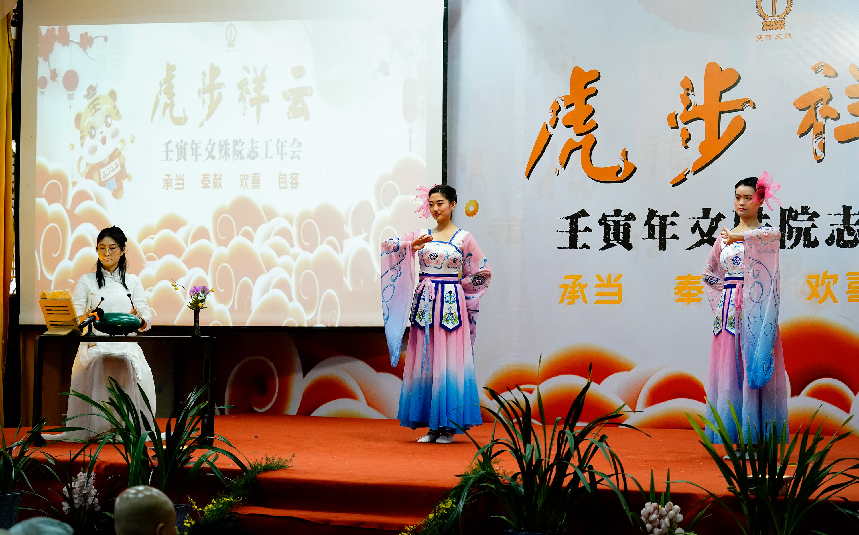下午2时,年会在通胤法师幽默风趣的主持下拉开帷幕。文殊院“人间佛教志工团”下属的香光念佛会、大悲法共修组、药师法共修组、外护组、奉香奉茶组、结缘处、咨询处、库房组、庄严组等志工小组各展所长,献上了一场精彩纷呈的演出:梵呗唱诵《念佛功德赞》,空灵鼓舞蹈《大悲咒》,歌曲《观音菩萨如秋月》、《观音菩萨偈》,舞蹈《大悲咒》、《吉祥中国年》、《情缘》、《采薇》,朗诵《祈祷》、《奉献中菩提芬芳》,柔力球表演《青杠染》,合唱《愿做菩萨那朵莲》等。所有节目都是由志工们在短短十余天内,自主策划、编排及演出的,凝聚了文殊院志工的智慧与才华,展现了志工团积极向上的精神风貌。