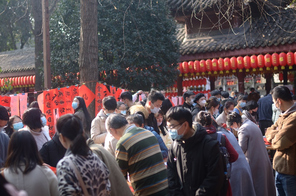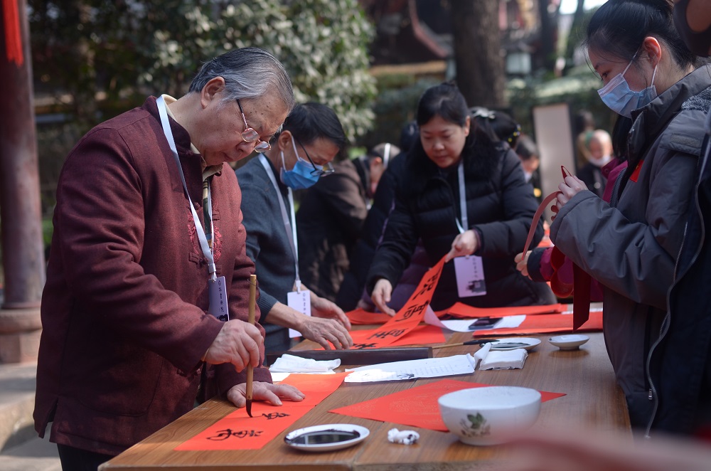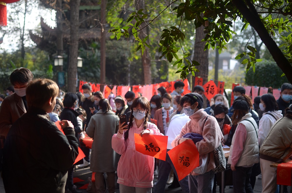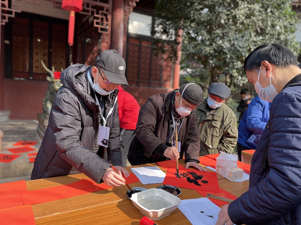 当天下午,成都空林书画院师生汇聚一堂,在书画院外举办了传统活动——“迎新纳福写春联”,现场书写春联和福字数百幅,与大众免费结缘,将壬寅虎年的新春祝福提前送到信众及游客手中。